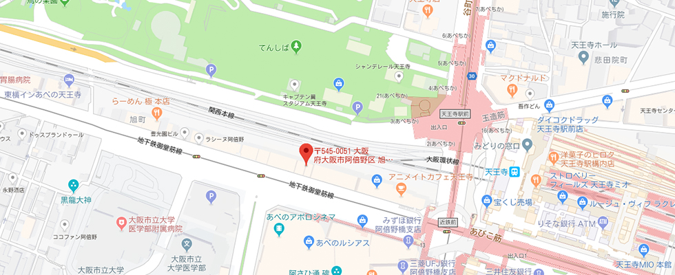 | 地下鉄御堂筋線天王寺駅 『御堂筋線5番出口』 の階段を上がり、進行方向後ろ向きへ1分程お進みください。 ドンキホーテの隣にある 『加賀タワービル』 の8階にございます。もしくは、ルシアスの道路挟んだ向かいです。 道に迷われた場合は、お気軽にお電話ください。 |
